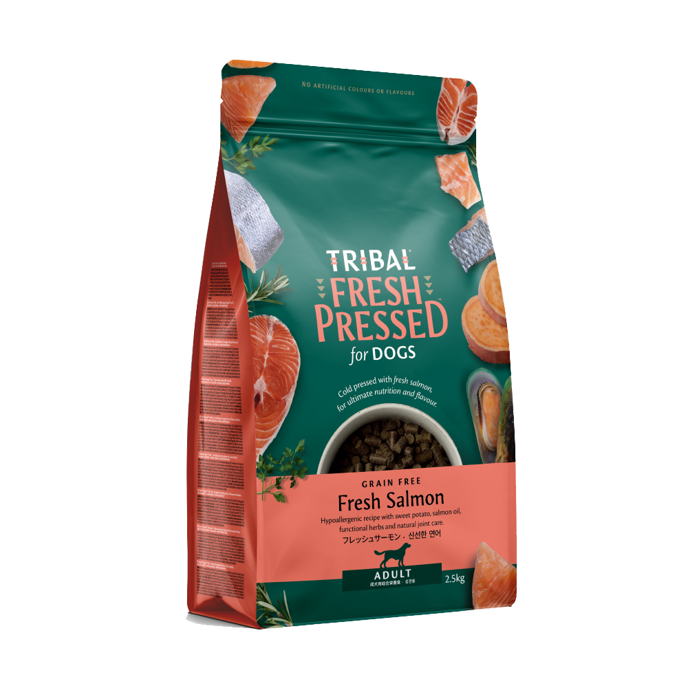 フレッシュサーモンを使用したミートミール不使用のコールドプレス製法。オメガ3脂肪酸を豊富に含み、低アレルギーで嗜好性に優れたドッグフードです。